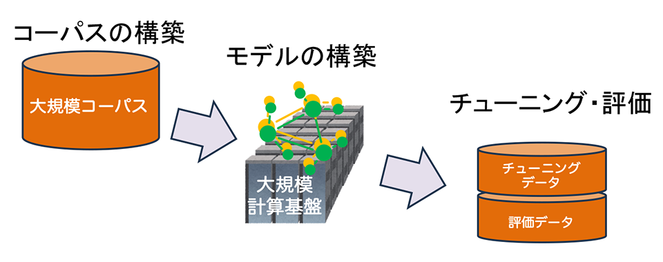 LLMの場合、モデルが事前学習するデータは「コーパス」に格納されています。コーパスとは、自然言語の文章を構造化し大規模に集積したデータベースのことです。モデルはコーパスからデータを読み込み、事前学習したのち、チューニング・評価と呼ばれるプロセスを経て最適化されます。つまり、LLMの開発は、①コーパスの構築、②モデルの構築、③チューニング・評価という3段階で進められるのです図3。
